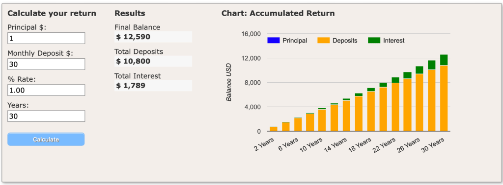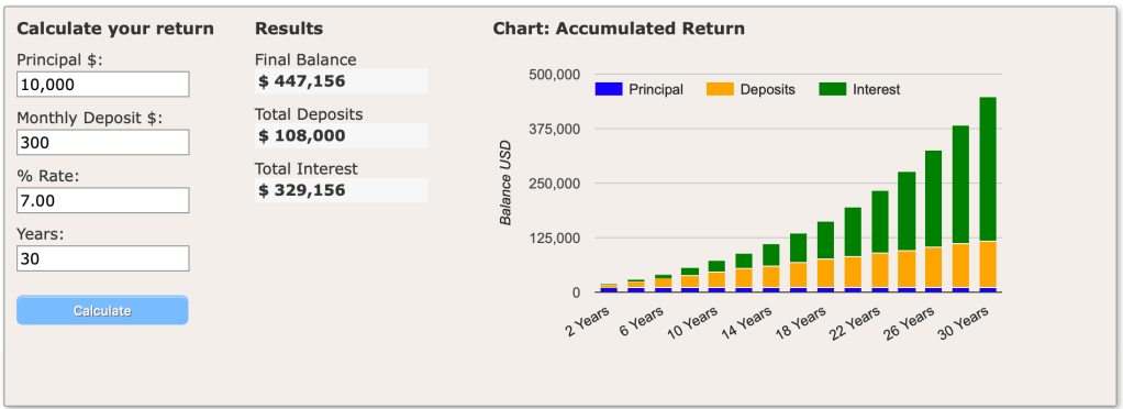 Now take into account investing money, if you started investing today with a principle of $10 000, plus adding a monthly contribution of $300 for 30 years. This is what you’ll get: