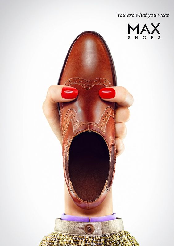 The Advertisement uses the placement of the arm holding up the shoe to show the relative position of the whole visual. The wrist of the arm is positioned at the bottom of the ad, giving reference to the overall image that it represents the ‘neck’ & subsequently the shoe itself represents a head with an open mouth.