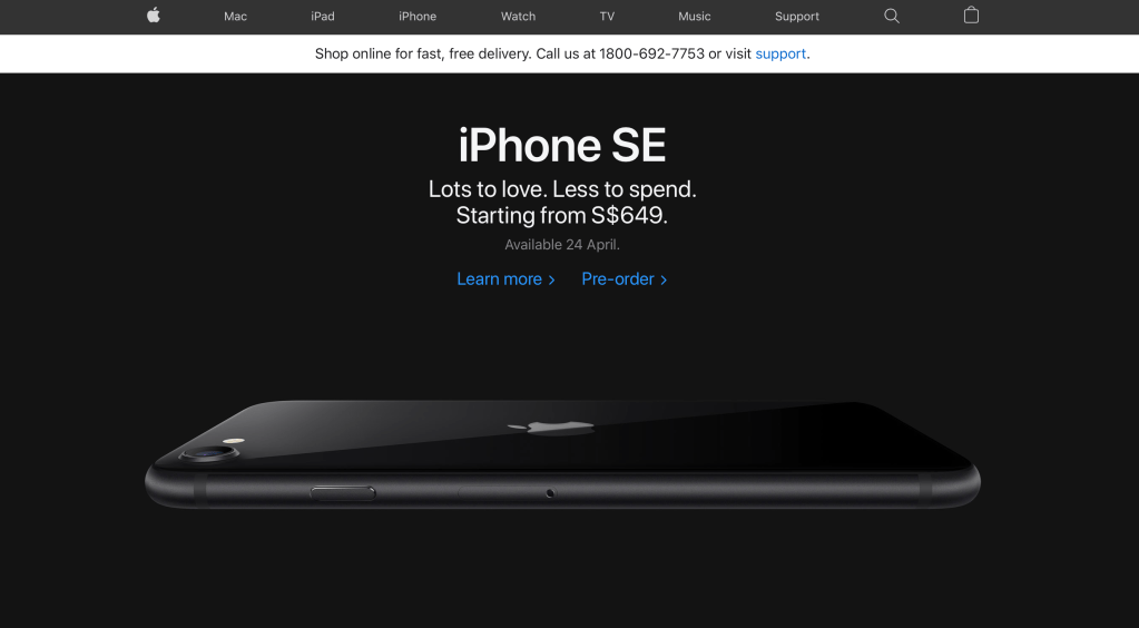 From the Apple Singapore online store, we can clearly see the hierarchy of the webpage, the categories are grouped and placed in the top bracket to show the different types of products while be separated by the different thickness and colours of the webpage. The highlight (main hierarchy) is given to the flagship product that has been newly launched and placed in its own bracket. The consumers (us) can immediately see what they’re trying to sell to us as our attention is drawn to the largest visual (iPhone SE).