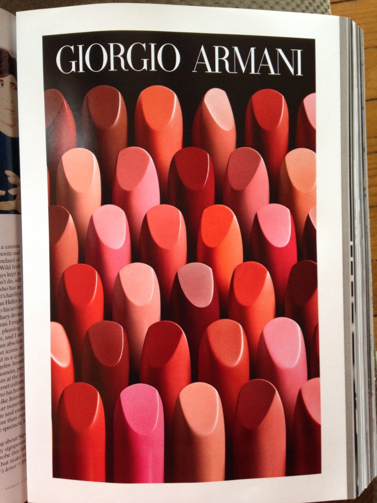 The many shades & hues of the lipsticks may seem to form their own unique groupings but due to their placement in rows, they all come together to form lines of neatly placed lipsticks that stand out in this commercial. Another thing to note is the randomly placed lipsticks in each row that point in a different direction, they themselves will form their own disjointed groups in the rows. Overall the unique groupings and orientations of the lipsticks form a interesting scene that attracts the viewer.